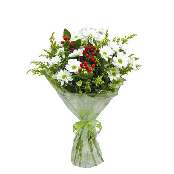 Состав букета: хризантема 3, гиперикум 3, солидаго 3.