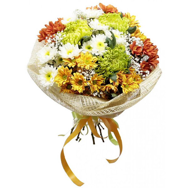 Состав букета: хризантема 9, хризантема одноголовая 3, гипсофила 1.