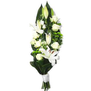 Состав букета: лилия 2, роза 7, эустома 2, хризантема 2, аспидистра 7.