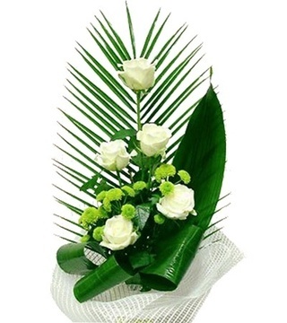 Состав: розы 5шт, аспедистра 4шт, пальма 1шт, хризантема Сантини 4шт.