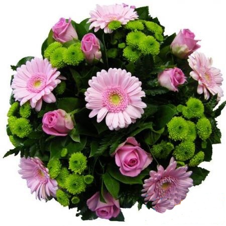 Состав: гербера(6), роза(7), хризантема Сантини(8), декоративная зелень.