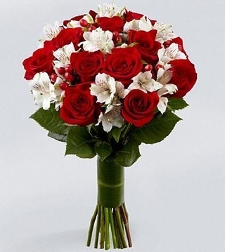 Состав: красная роза(15), белая альстромерия(9), гиперикум(5), декоративная зелень.