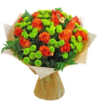 Состав: роза коралловая(16), хризантема Сантини(9), декоративная зелень.