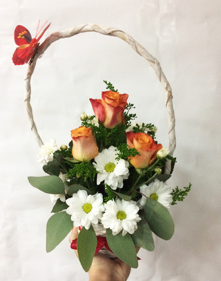 Состав: хризантемы куст 2, солидаго 1, розы 3, эвкалипт 1.