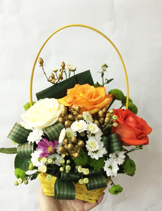 Состав: хризантема 1, розы 3, гиперикум 2, аспедистра 2.