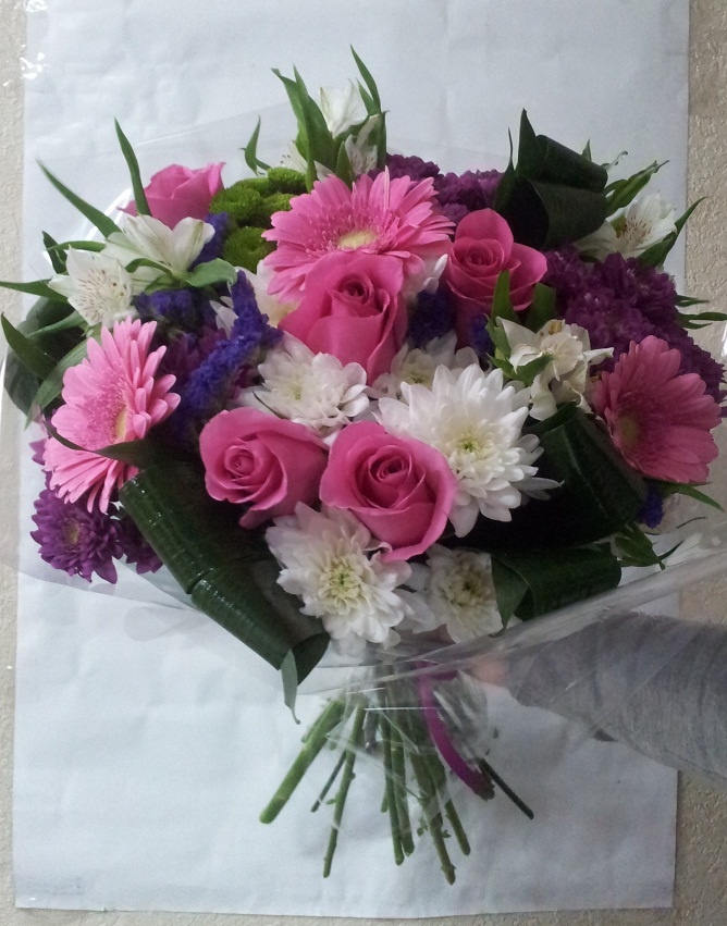 Состав: роза (5), гербера (5), хризантема кустовая (6), альстромерия, аспедистра, статица