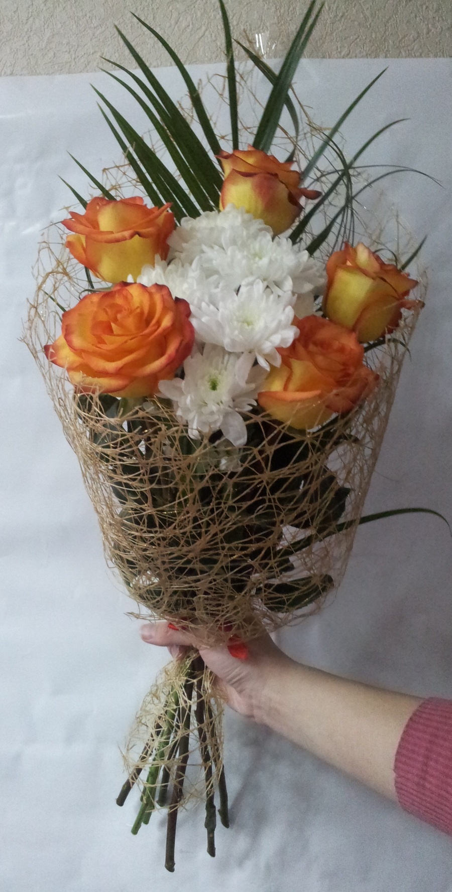 Состав: роза (5), хризантема кустовая (2), пальма (1).