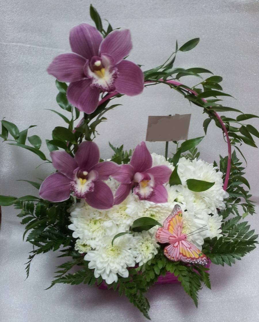 Состав: орхидея, хризантема кустовая, итальянский рускус, папоротник.