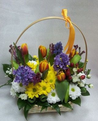 Состав: тюльпаны, гиацинт, хризантема, гиперикум, капс, салал.