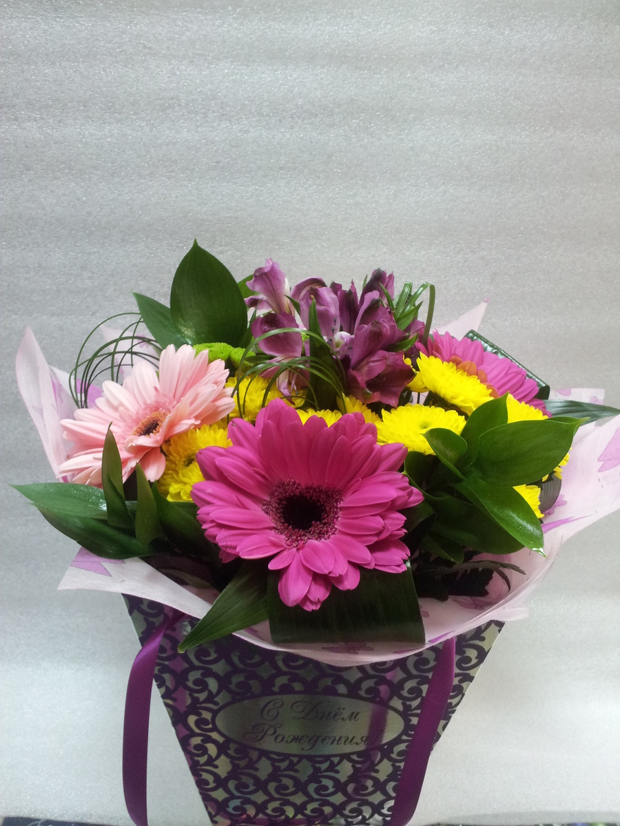 Состав: гербера, хризантема, альстромерия, рускус, берграс.