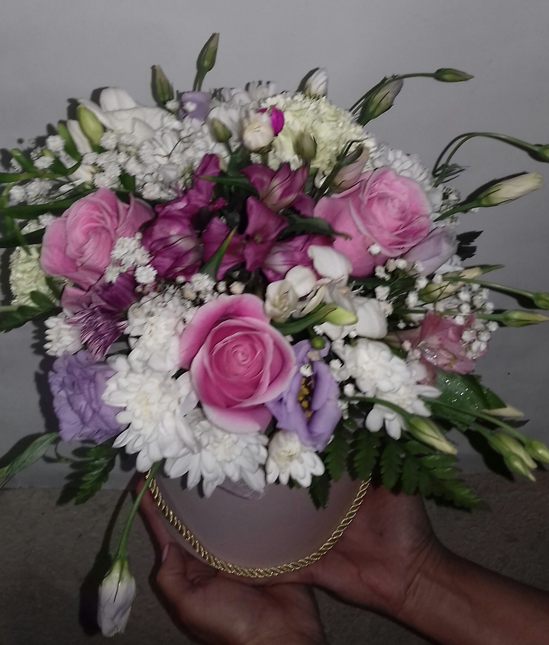 Состав: роза, хризантема, эустома, альстромерия, гипсофила, папоротник.