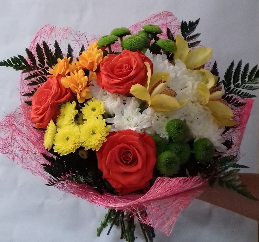 Состав: роза, хризантема, орхидея, папоротник.