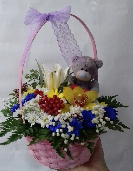 Оформление: мягкая игрушка, корзина, лента.