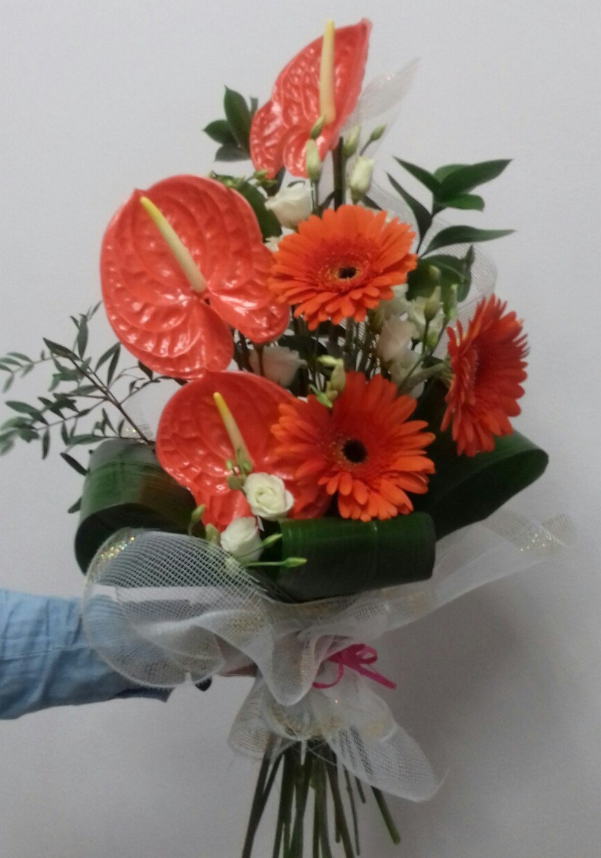 Состав: антуриум, эустома, рускус, аспедистра, гербера.