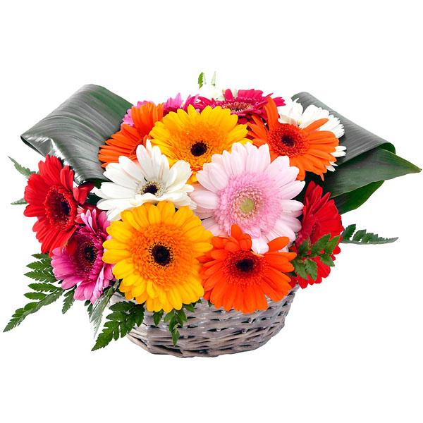 Состав композиции: герберы 15, аспедистра 2, папортник 4.