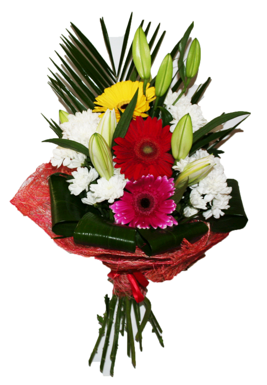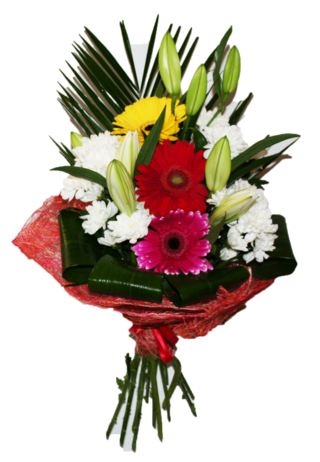 Состав букета: герберы 3, хризантемы 3, лилия 2, пальма 1, аспедистра 4.
