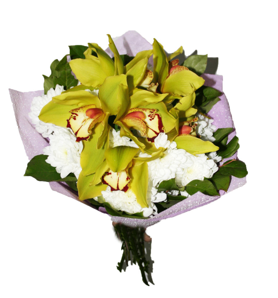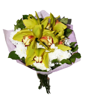 Состав букета: хризантема 5, орхидея 7, салал 3.
