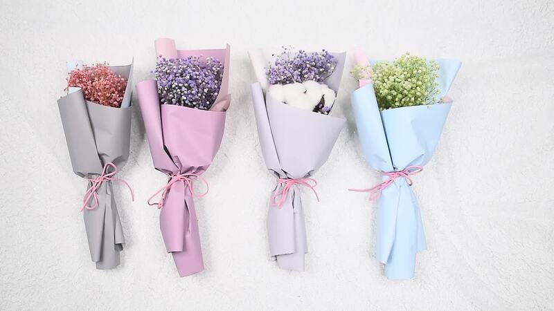 Недостаток можно отметить только один – слишком простой внешний вид. Однако Последние несколько набирает популярность корейский тренд упаковки, созданный из нескольких кусочков материала для придания пышности. В таком оформлении можно подарить роскошные хризантемы, розы, гипсофилы или совсем миниатюрный презент из одного цветка, который часто преподносится как корпоративный подарок.